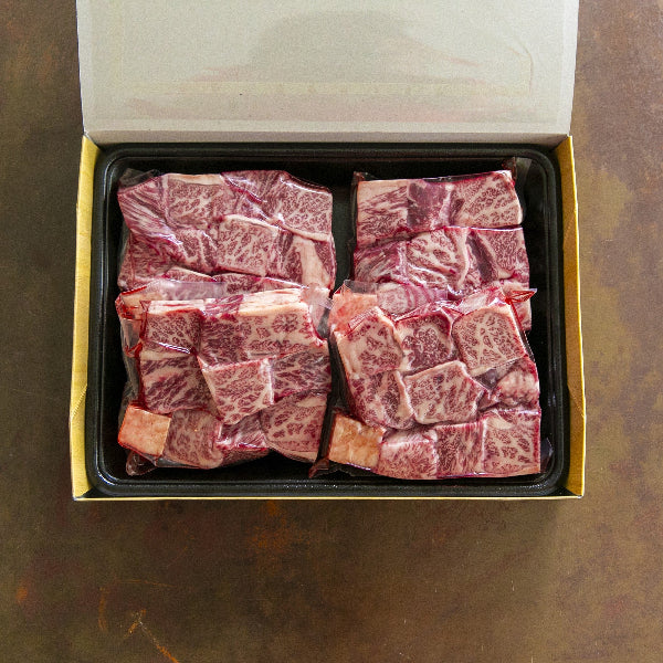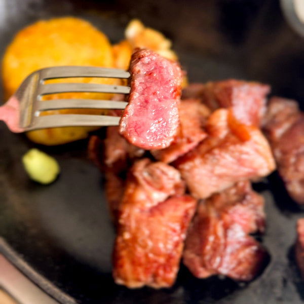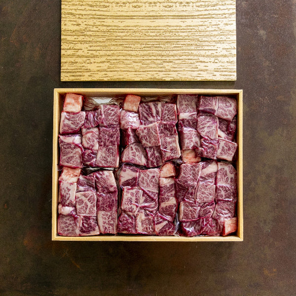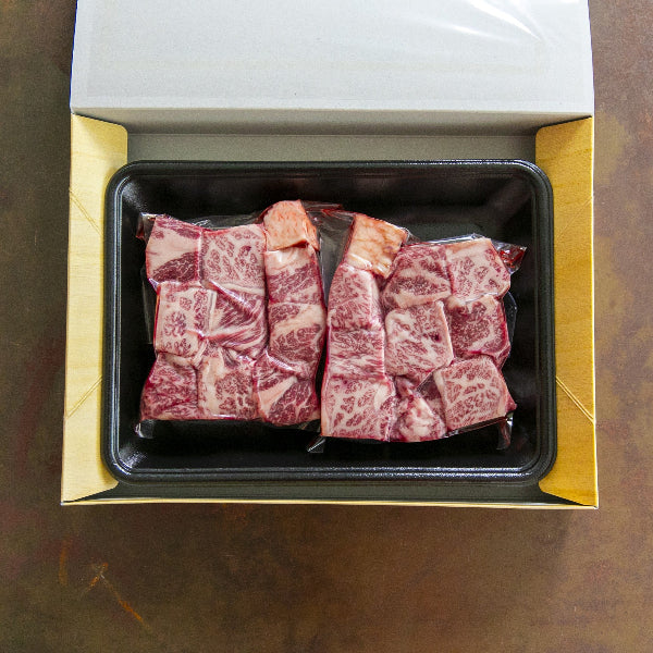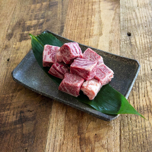 三角バラ、カイノミなど、通常は特上カルビ等として焼肉用にお出ししているものを、食べ応え抜群のサイコロステーキサイズに手切りしてお送りします。