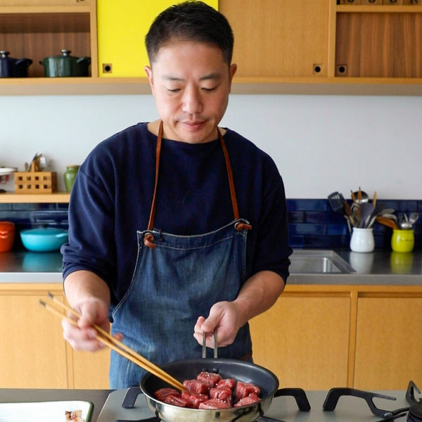 どんなサイズがよりおいしいか、生産者の北島藤原精肉店さんに、複数のバリエーションでご相談を重ね、実現に至りました。機械でなく全て手切りしているからこそ、叶えられた理想的なサイズは、サイコロステーキの中でもかなり大きめかと思います。「通常のステーキと違って6面焼けるから、火通りがイメージしやすい」と栗原心平。